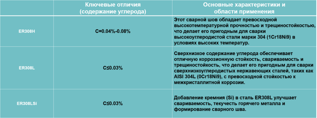 ER308H — это сварочная проволока из аустенитной нержавеющей стали. Её ключевой особенностью является высокое содержание углерода, что делает её особенно подходящей для применений, требующих высокой жаропрочности. В таблице ниже представлено сравнение с ранее упомянутыми ER308L и ER308LSi для более наглядной демонстрации различий.
