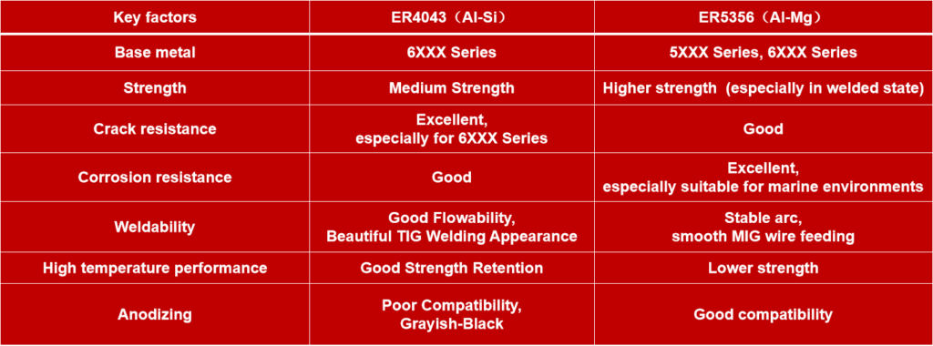 ● If the weld requires solution treatment and artificial aging (e.g., T6 temper), ER4043 should be selected. ER5356 significantly loses strength after high-temperature heat treatment.