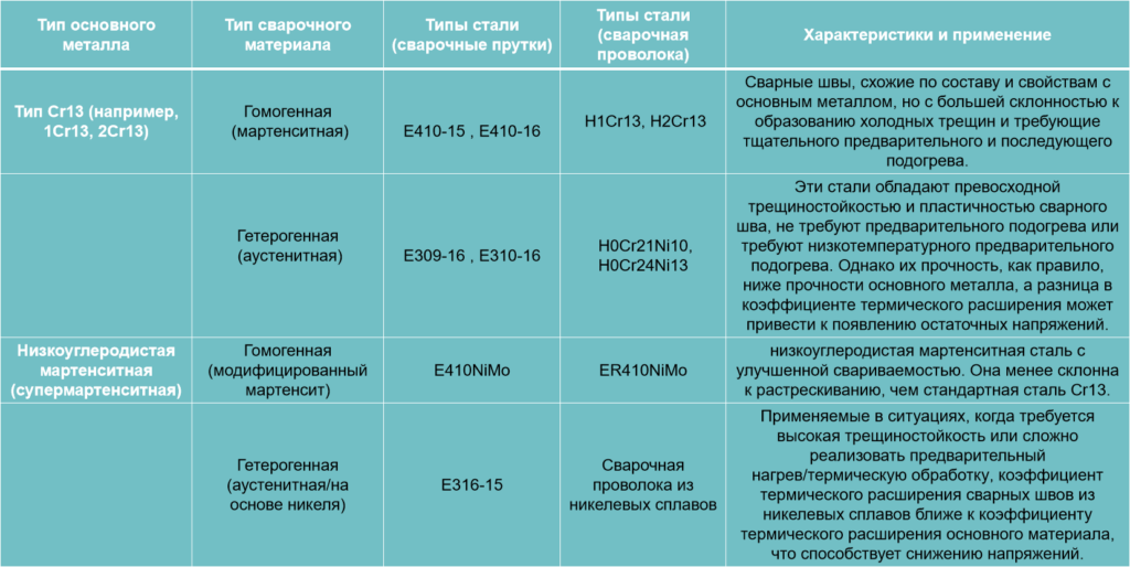 Сварочные материалы для мартенситной нержавеющей стали в первую очередь подразделяются на гомогенные (соответствующие основному материалу) и гетерогенные (аустенитные или на основе никеля). При выборе материала учитывайте требования к характеристикам сварного шва (прочность, коррозионная стойкость), условия процесса (предварительный подогрев, возможность термообработки) и стоимость.
