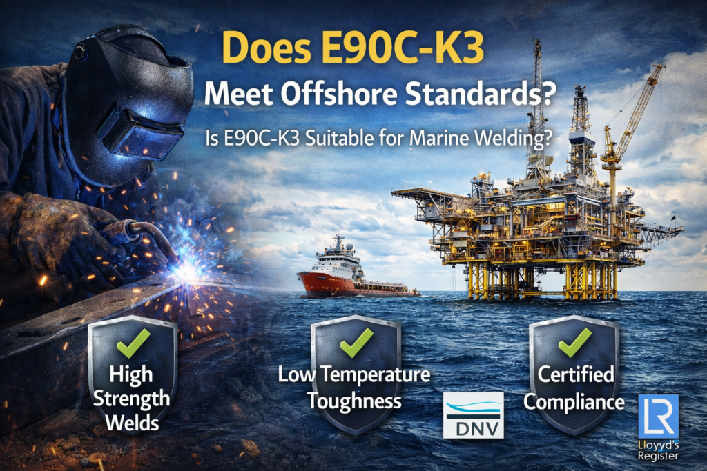 Offshore welding applications demand extreme reliability. From oil platforms to marine structures, weld metal must withstand saltwater corrosion, dynamic loading, and low-temperature environments.E90C-K3.