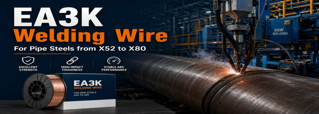 EA3K welding wire is closely associated with pipe steels from X52 to X80 because the publicly visible product literature repeatedly places it in exactly that range. It is presented as a 0.5% molybdenum special-purpose SAW wire with higher manganese and silicon, recommended for seam welding of pipe and for high-strength plate. That makes it a relevant option for buyers who need a submerged arc wire aimed at line-pipe style fabrication rather than ordinary general-purpose welding.