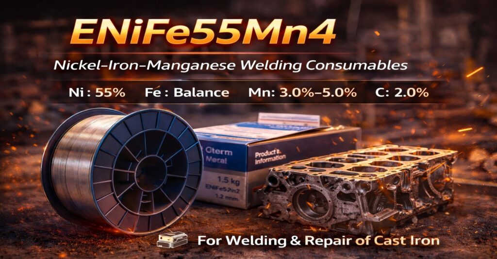 ENiFe55Mn4 (1.2 mm) is a high-performance Ni-Fe-Mn welding wire suitable for MIG welding of cast iron and dissimilar metals. Proper preheating, controlled heat input, and slow cooling are essential to achieve crack-free welds and optimal mechanical properties.