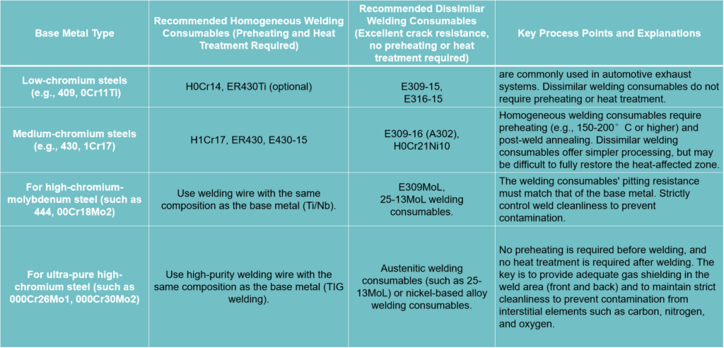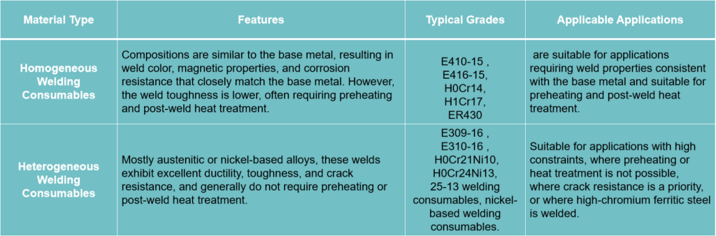 Ferritic stainless steel welding consumables are primarily divided into two categories: homogeneous and heterogeneous. The table below provides a quick overview of their characteristics and typical grades: