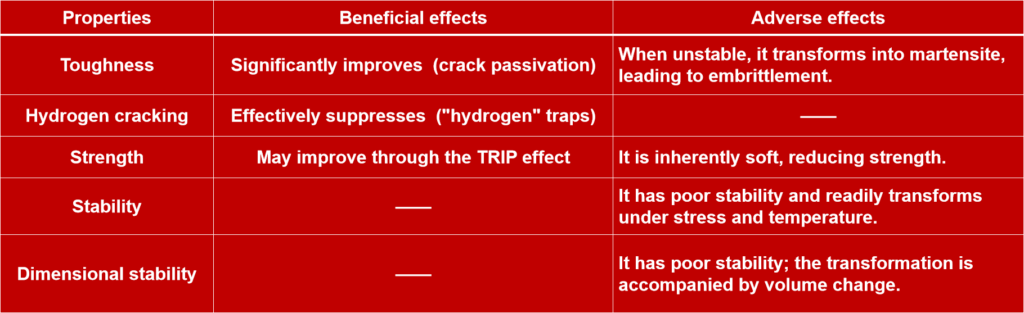 Retained austenite in weld metal is a double-edged sword; its presence and quantity have a complex and crucial impact on weld performance.Residual austenite