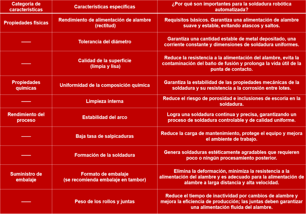 A continuación, se detallan los aspectos específicos de los requisitos más exigentes que se imponen al alambre de soldadura en la soldadura robótica automatizada:
