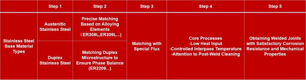 The core principle for selecting stainless steel SAW is “equal composition matching,” meaning the chemical composition of the welding wire must be similar to that of the base metal to ensure that the corrosion resistance of the weld is consistent with that of the base metal. The selection logic can be summarized as follows: